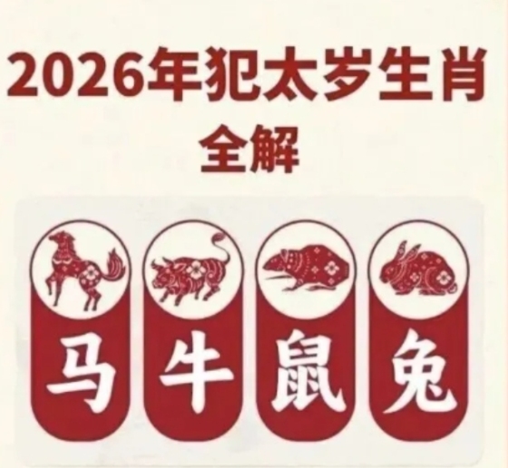 2026年为丙午马年,天干丙火与地支午火相叠,火气旺盛,注定是充满机遇与挑战的一年。在传统民俗中,犯太岁(值、冲、刑、害、破)被认为会影响个人运势,尤其在事业、财运、感情、健康等方面波动较大。本年度,生肖马、鼠、牛、兔将面临不同形式的犯太岁影响。一、2026年犯太岁生肖及影响解析1. 生肖马:值太岁+刑太岁(双重冲击)事业:本命年叠加刑太岁,工作压力骤增,项目推进受阻,同事关系紧张,晋升机会易被截胡。财运:正财波动,偏财风险极高,投资易亏损,需警惕合同陷阱。感情:情绪敏感,与伴侣易因小事争吵,单身者桃花质量