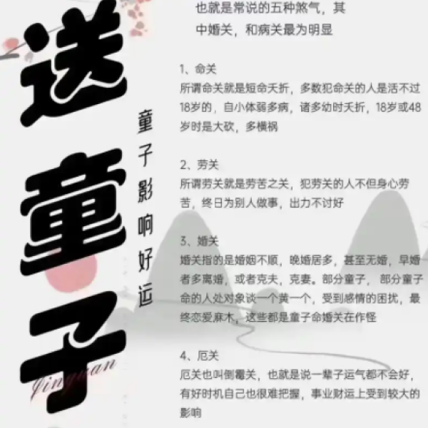 童子命,这一充满神秘色彩的特殊命格,在民间信仰与道教文化中一直备受关注。相传童子命者前世为仙童或侍奉神灵的特殊身份,因种种缘由转世人间,需历经磨难以偿还因果。其命运常伴随体弱多病、婚姻不顺等坎坷,令人心生困惑。
